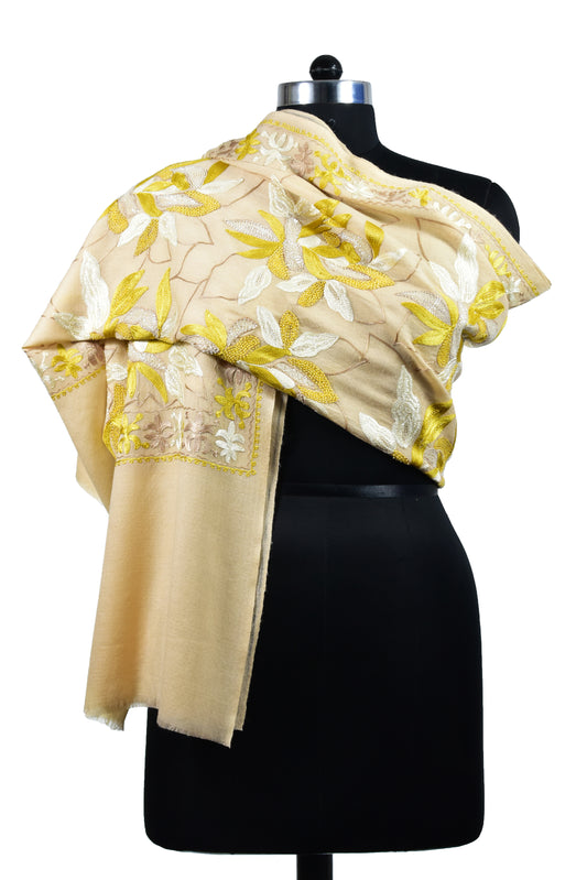 Luxurious Cashmere Wool Stole in Mexican Cornsilk Yellow with Intricate Leaf Motifs with Artisan Ari & Handwork Embroidery by Riem
