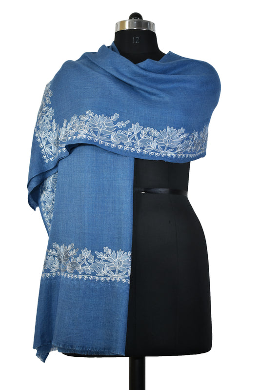 Royal Kashmiri Cashmere Wool Stole in Yale Blue with Multicolor Hashidar Single Stitch Embroidery Floral Flowers Deign Border