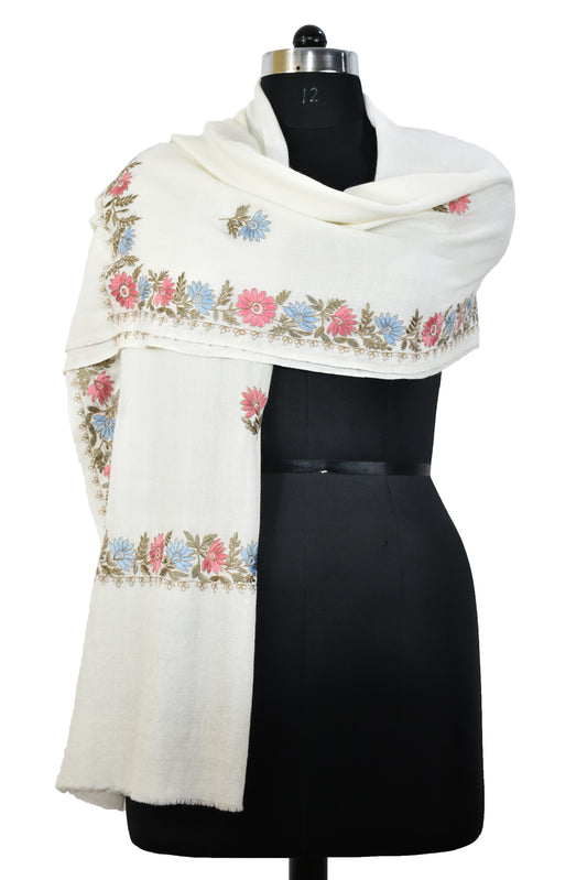 Luxurious Kashmiri Cashmere Wool Stole in White with Multicolor Hashidar Floral Flower Vein Design Single Stitch Embroidery